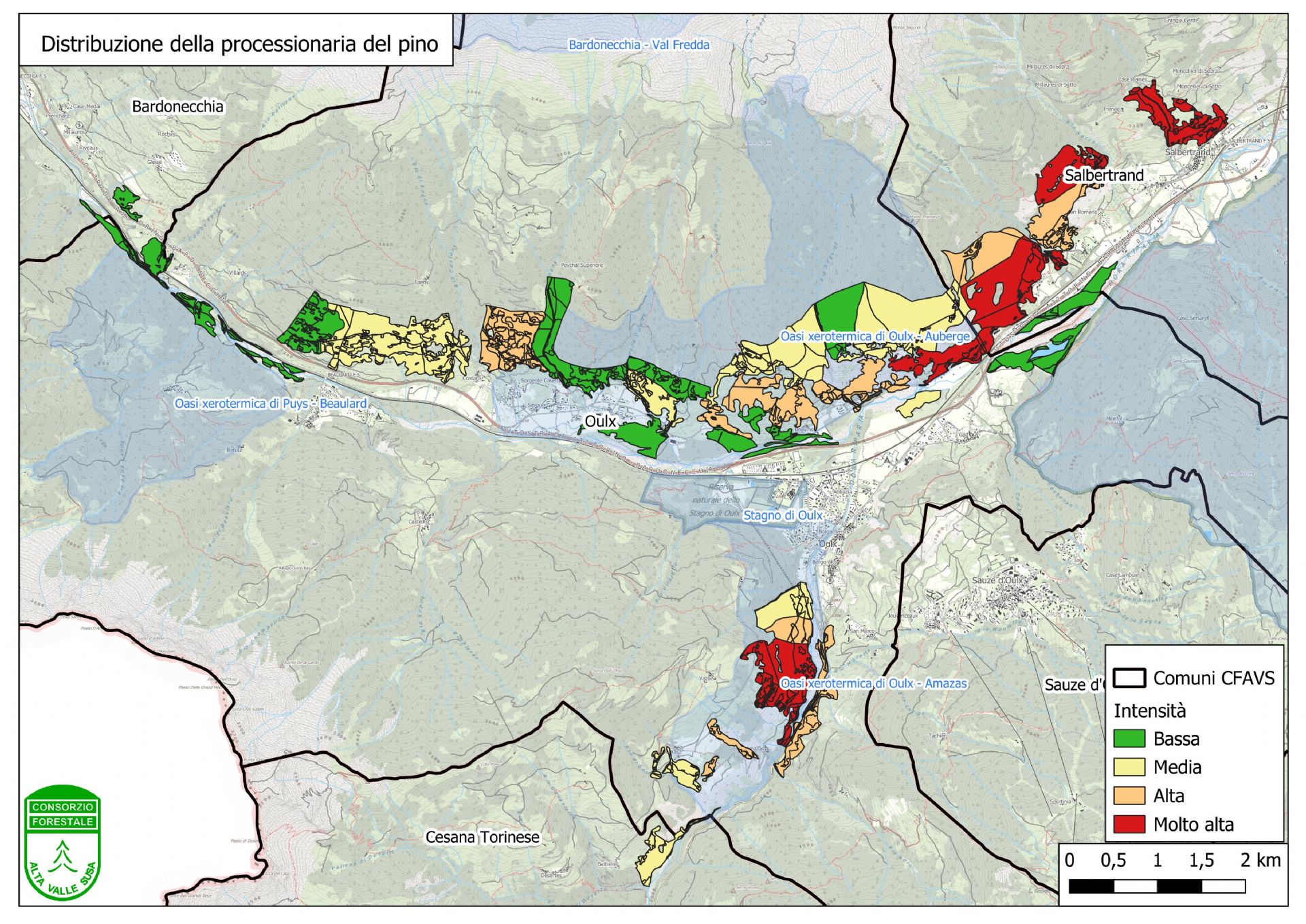 Com’è noto a chi vive o transita nel nostro territorio, le vaste pinete presenti in Alta Val di Susa sono soggette ad una infestazione da parte del lepidottero Thaumetopoea pityocampa, comunemente conosciuto come processionaria del pino. Negli ultimi dieci anni si è assistito ad un incessante aumento dell’area infestata, che ora raggiunge i due assi principali dell’alta valle, verso Bardonecchia e verso Cesana. Parimenti si è assistito ad un innalzamento di quota nelle pinete dei versanti esposti a sud. La distribuzione attuale dei nidi all’interno delle aree boscate (quindi escludendo giardini e alberi isolati) è riportata nella mappa sottostante, suddivisa per intensità della presenza.